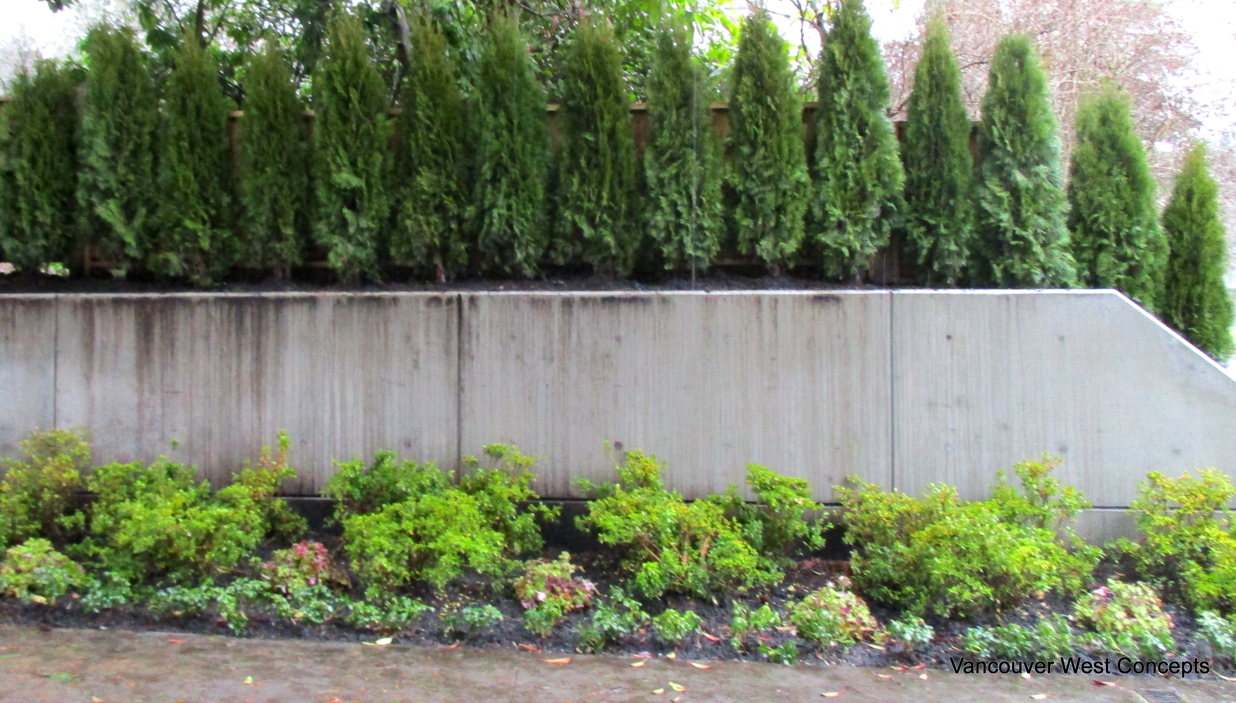 Concrete retaining wall with cedar hedge and planting bed