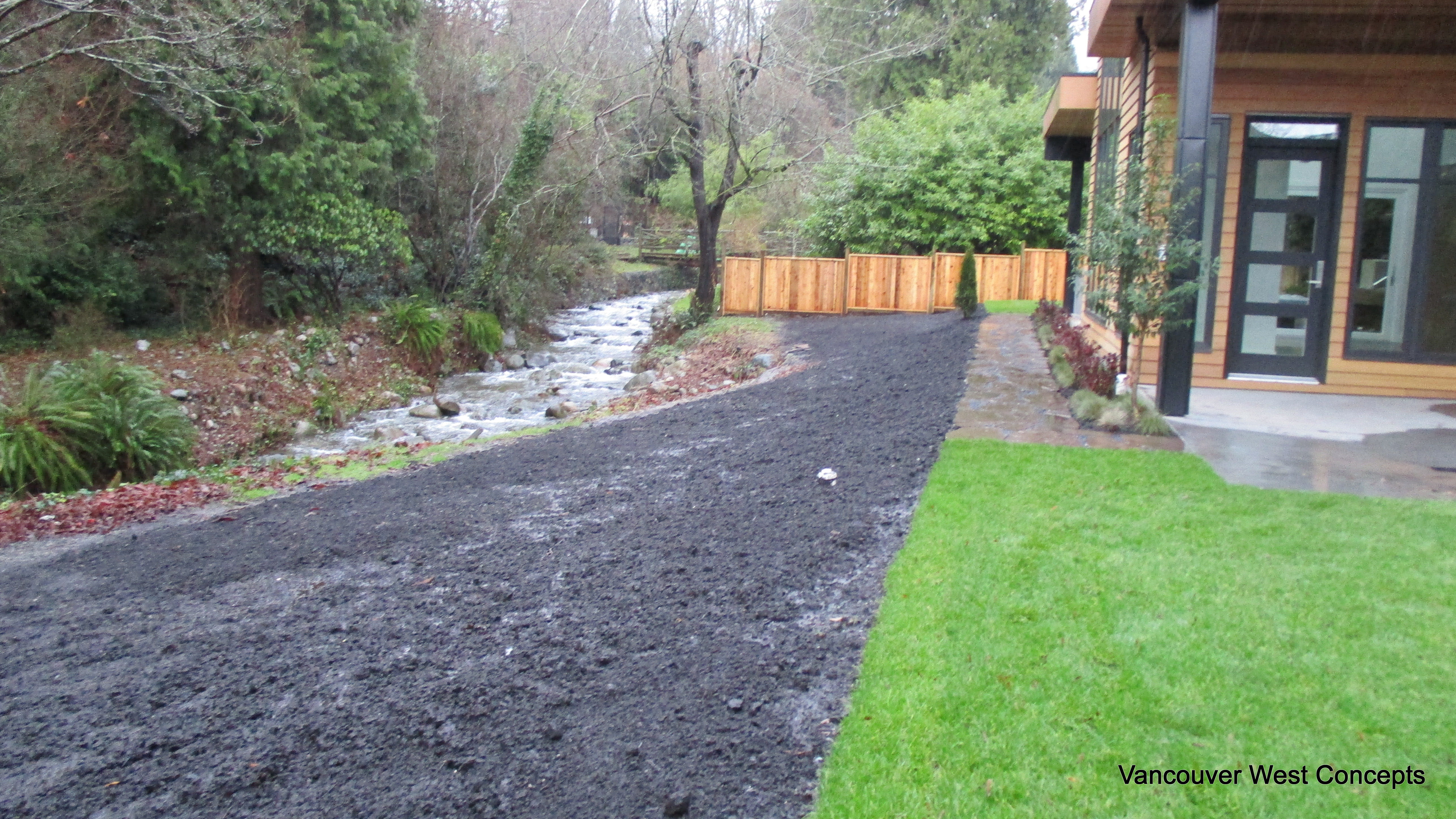 Walkway, planting bed and bordering Riparian area